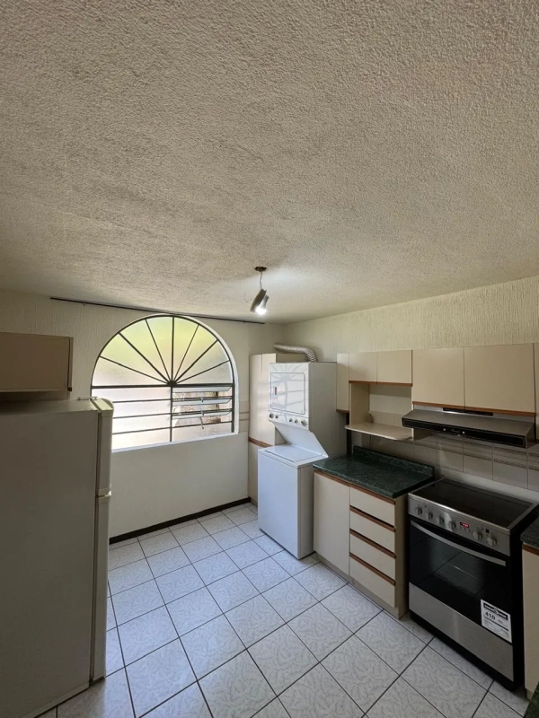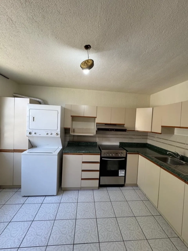 Cocina con línea blanca (estufa, refrigerador, torre de lavado)