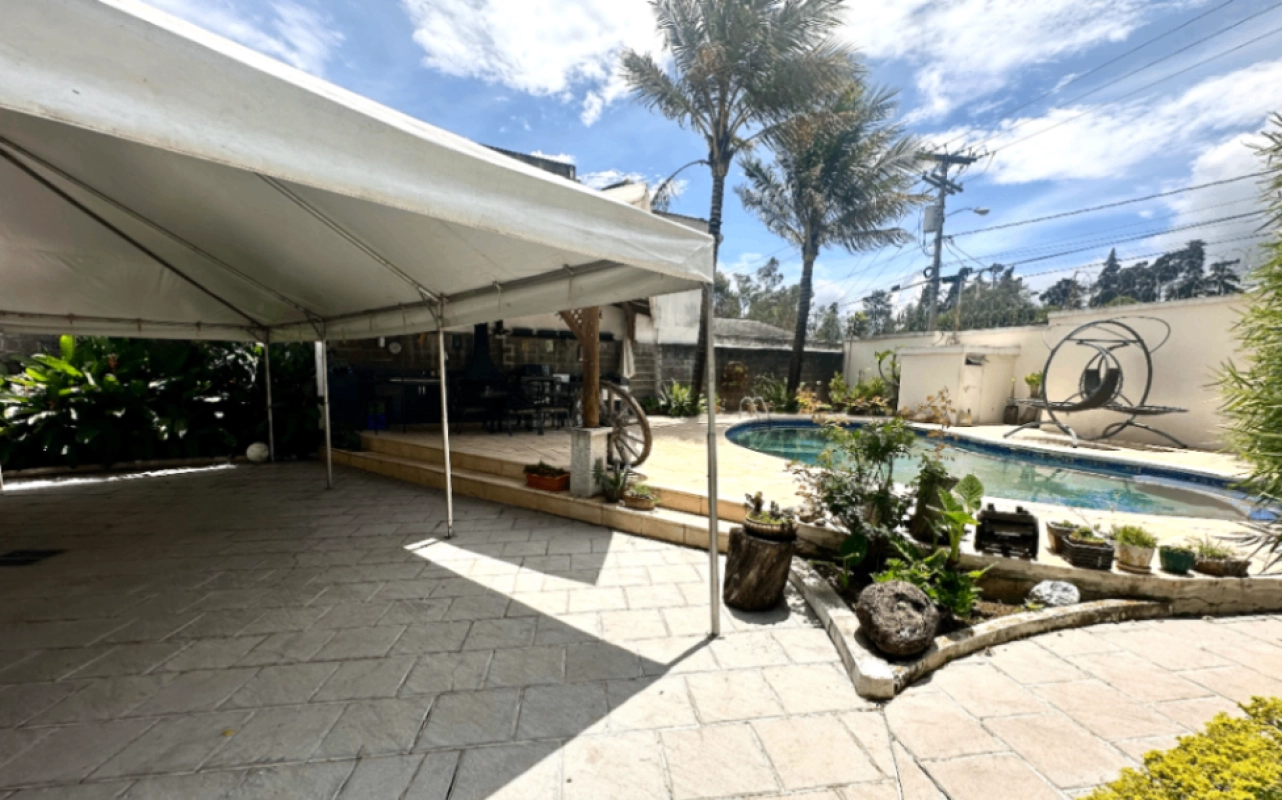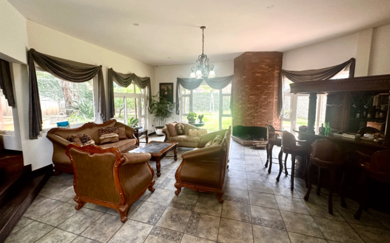 La casa cuenta con 10 parqueos o más, 3 bodegas, 6.5 baños, 4 dormitorios con walking closet, estudio adicional, varias salas y áreas de servicio. Entre sus espacios más destacados se encuentran vestíbulo de entrada, sala principal con chimenea, comedor, cocina con despensa, sala familiar, balcones, pérgola equipada, piscina, amplios jardines y terraza.