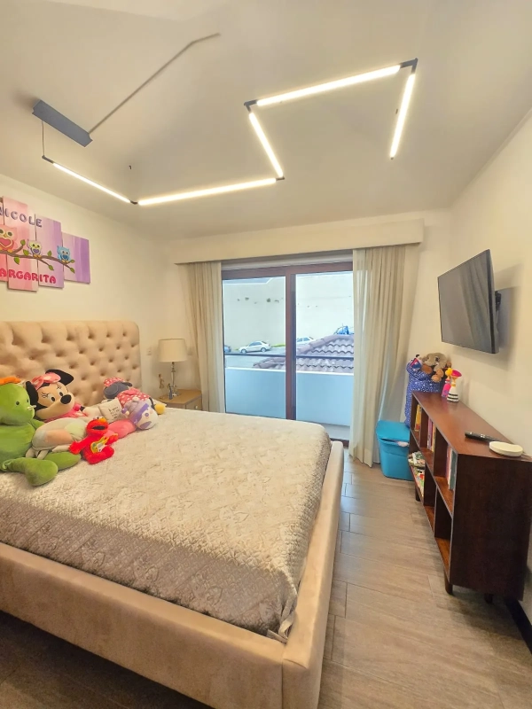 Sala, comedor con salida a un hermoso jardín con pergola tiene hermosa vista a la ciudad. La cocina muy amplia con acabados modernos incluye la línea blanca, tiene garage para 3 vehículos techados + 1 no techado (cruzado)