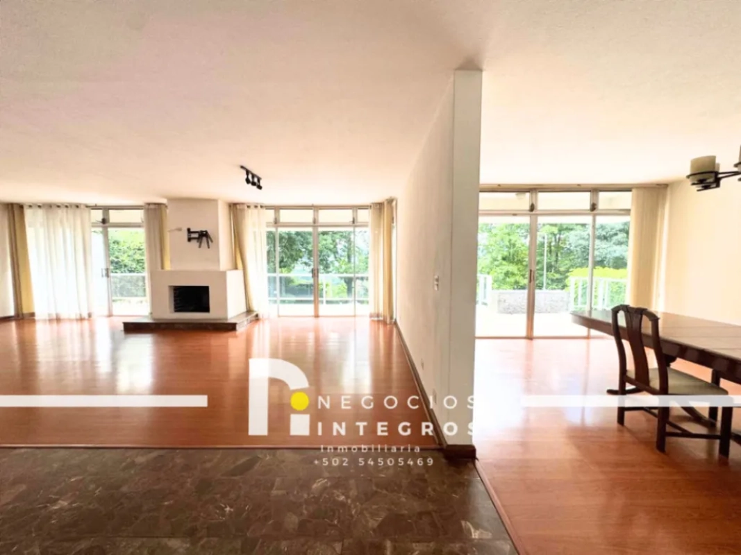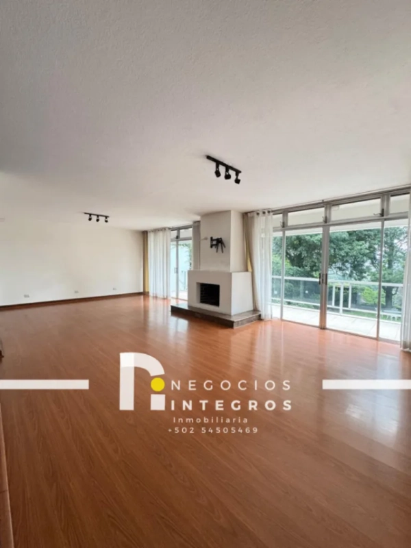 – Sala principal con chimenea, ventanales de vidrio y salida al balcón