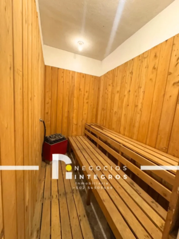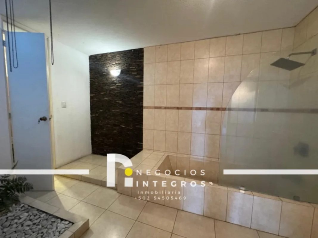 – Baño completo con doble lavamanos, sauna y área tipo jardín interior pequeño (piedras decorativas)